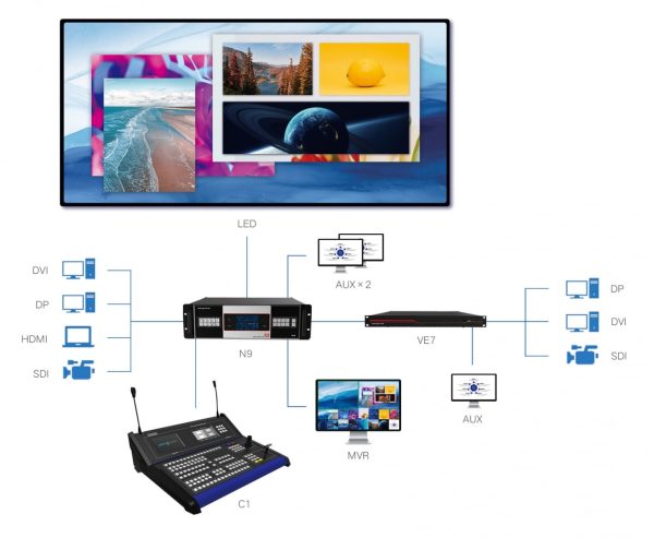 For stage control or TV studio applications, quick and stable control is a must. The C1+N9+VE7 is the perfect solution to meet the needs of this type of application. The N9 acts as a switcher, splicer and processor, the VE7 is a video Input Expander, while the C1 console handles the stage control. With a dual-screen design, the C1 removes the necessity of complex and slow software operation, allowing you to effortlessly control the stage.